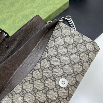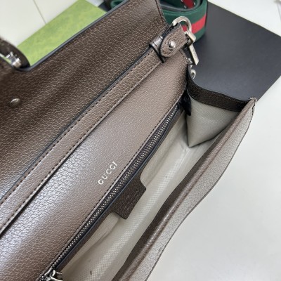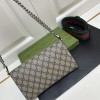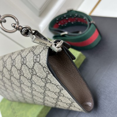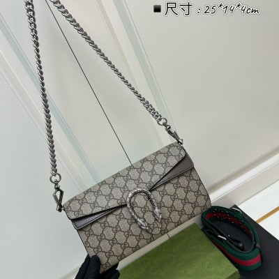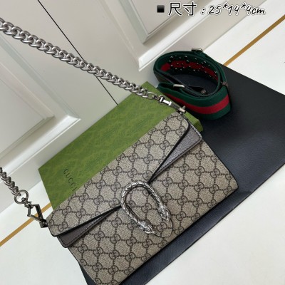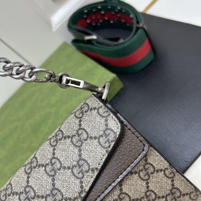 𝐷𝑖𝑜𝑛𝑦𝑠𝑢𝑠时尚单品永远少不了的酒神包又添新成员啦[耶]依然采用辨识度极高的虎头锁扣、包身小巧轻便. 经典PVC老花➕牛皮❗️搭配2条肩带 链条是现在最流行的腋下背法、最重点的红绿织带饰以饰钉“Gucci”DlY斜挎带太好看了!内部容量大、翻盖口袋双接档、还可当手包使用。
