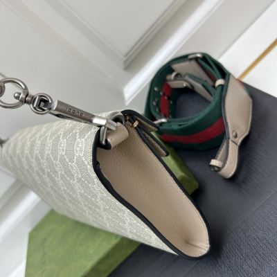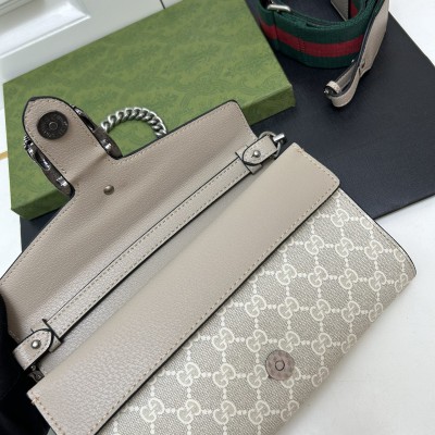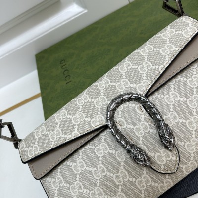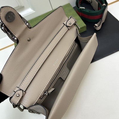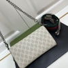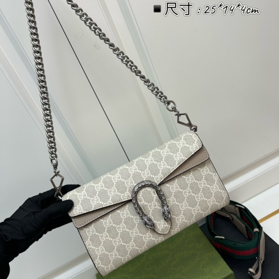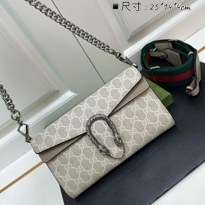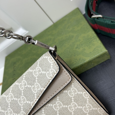 𝐷𝑖𝑜𝑛𝑦𝑠𝑢𝑠时尚单品永远少不了的酒神包又添新成员啦[耶]依然采用辨识度极高的虎头锁扣、包身小巧轻便. 经典PVC老花➕牛皮❗️搭配2条肩带 链条是现在最流行的腋下背法、最重点的红绿织带饰以饰钉“Gucci”DlY斜挎带太好看了!内部容量大、翻盖口袋双接档、还可当手包使用。