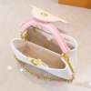 本款 Capucines BB 手袋取材 Taurillon 皮革,隐约映现同一色彩的浓淡变化,令经典构型更为瞩目,搭配珐琅 Monogram 花卉链条,可手提、肘挎或系上肩带肩背或斜挎。