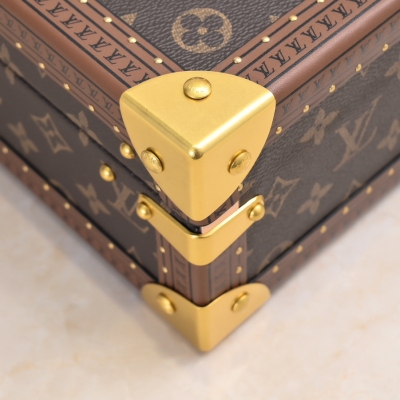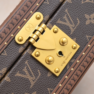 LV 顶级原版 M20040 M20341,M13513珠宝盒 杏色 可分层分类存放戒指、项链、手链、耳环与手镯。配有小衬垫,确保珠宝存放妥善舒适。尺寸优雅、设计实用、安全牢靠,是外出旅行的好伴侣。- 4个方形隔层,可存放耳环- 中心2个方形隔层,可存放大号耳环或手链/手镯- 2个较长的矩形隔层,可存放较细较大的戒指- 2个侧边隔层,可存放手镯与手链- 1个中部隔层,可存放项链- 金色金属包角- 菱形纹饰- 钉头装饰- S形锁扣- Monogram帆布- 天鹅绒内衬- 金色金属 。 尺寸:23x11x23cm