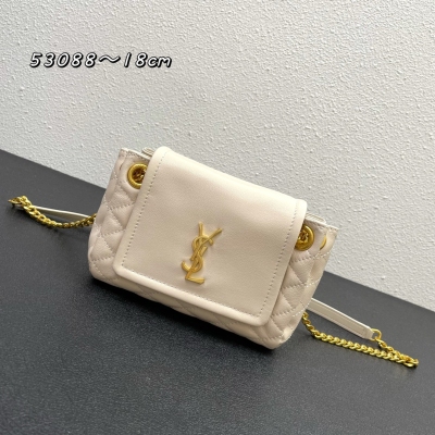 YSL Monogram nokita出货 头层牛皮 轻巧大气 主要是特特特能装 前翻盖饰以金属联结YSL字母标志,饰菱形纹绗缝包缝,搭配链条和皮革背带,内部主隔层一个平袋,新鲜感十足!yn型号:53088 尺寸:18x13x6cm