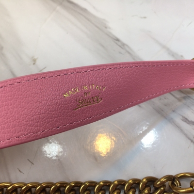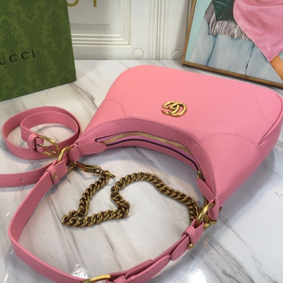 (Gucci Cosmogonie)731817系列在意大利历史悠久的蒙特城堡亮相。秀场上,不同时代、不同地理位置的美学元素交相辉映,将过去与当下相连结。这一全新的新月造型小号肩背包从品牌典藏元素汲取灵感,采用柔软皮革材质呈现,并饰有在20世纪70年代亮相的双G标志。 它配有两条可肩带,一条采用皮革材质,另一条则采用具有辨识度的Gucci金色调金属链设计,充分诠释了品牌所推崇的实用设计理念!尺寸:25/19/7cm,颜色:粉色