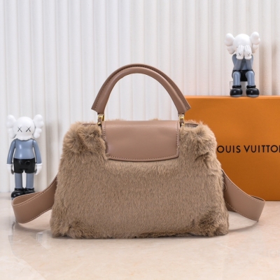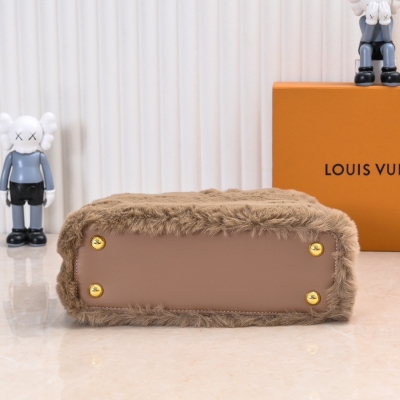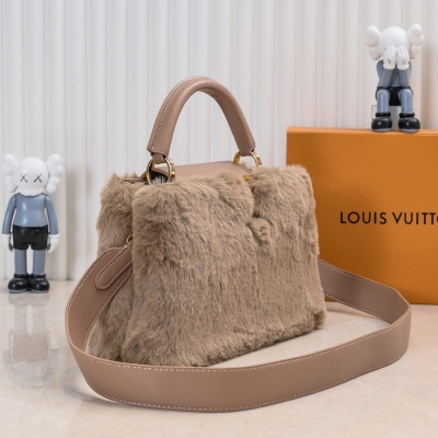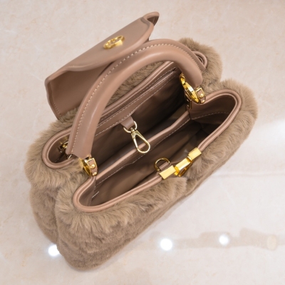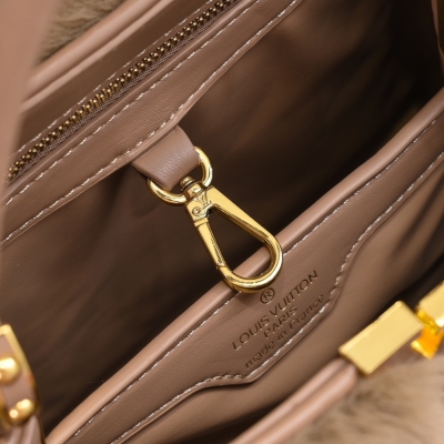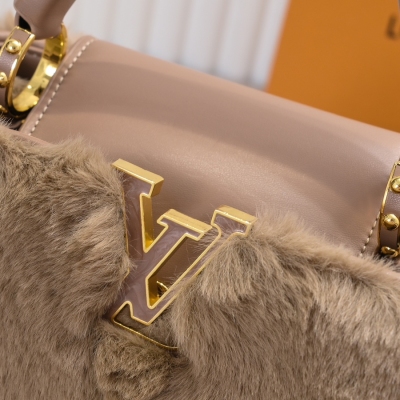 LV/升级版M22388杏色大号 出自2024新款本款采用奢华水貂毛Capucines为深沉绒毛面料Monogram释放瞩目光芒 随附编织链条肩带 肩背斜挎随心切换 可为华美晚装造型增添瞩目亮色