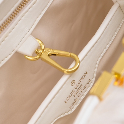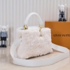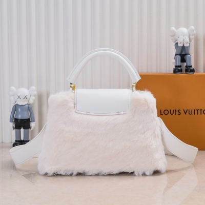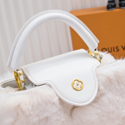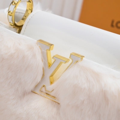 LV/升级版M22388白色大号 出自2024新款本款采用奢华水貂毛Capucines为深沉绒毛面料Monogram释放瞩目光芒 随附编织链条肩带 肩背斜挎随心切换 可为华美晚装造型增添瞩目亮色