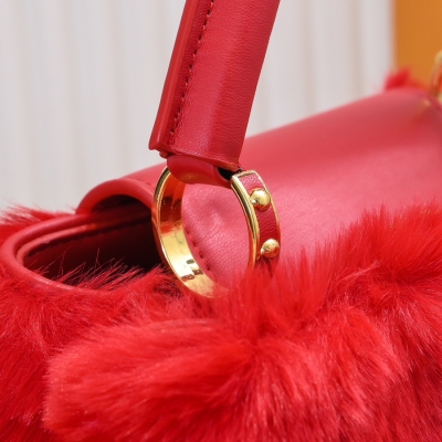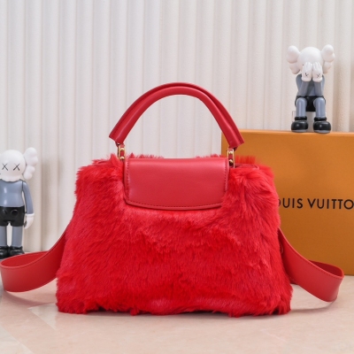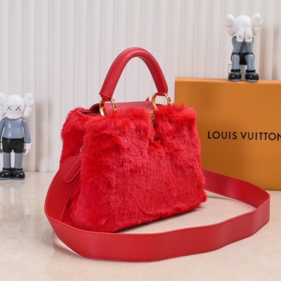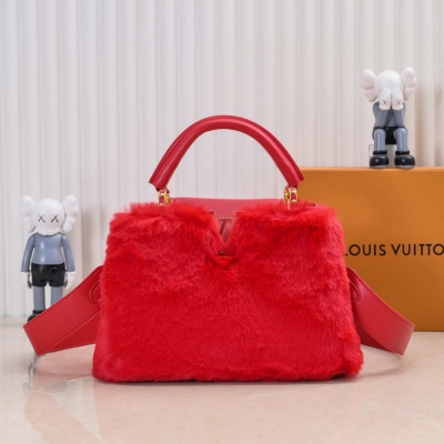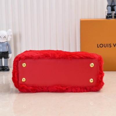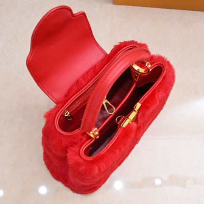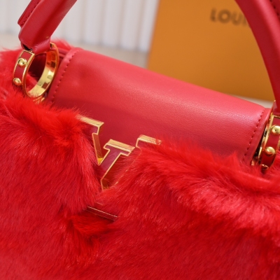 LV/升级版 M22388红色大号 出自2024新款本款采用奢华水貂毛Capucines为深沉绒毛面料Monogram释放瞩目光芒 随附编织链条肩带 肩背斜挎随心切换 可为华美晚装造型增添瞩目亮色