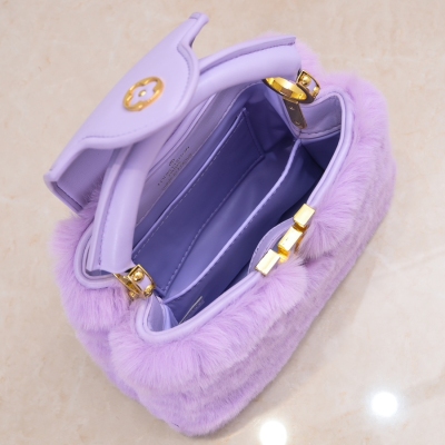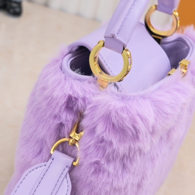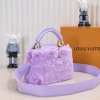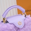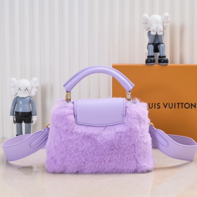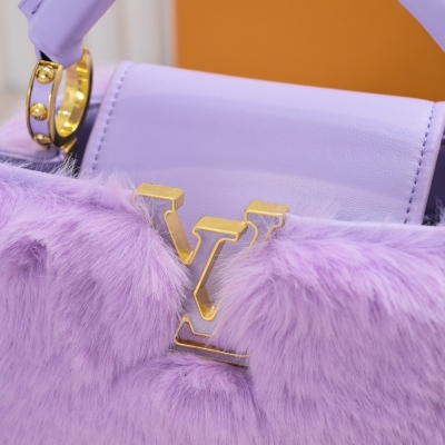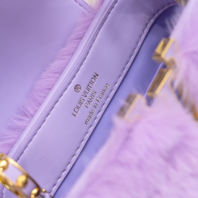 LV/升级版 M22387紫色小号 出自2024新款本款采用奢华水貂毛Capucines 为深沉绒毛面料Monogram释放瞩目光芒 随附编织链条肩带 肩背斜挎随心切换 可为华美晚装造型增添瞩目亮色