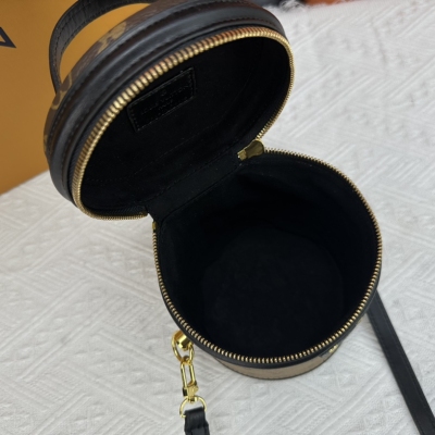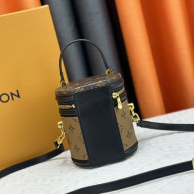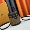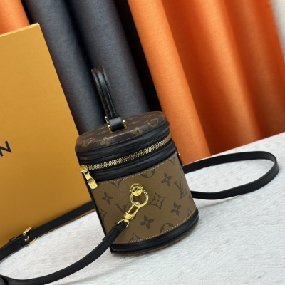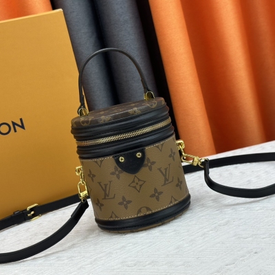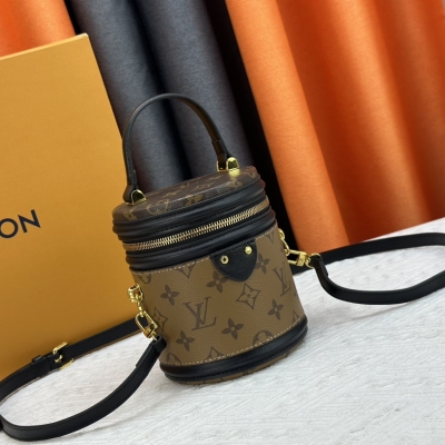 LV/M82952 M43986老花 黄花 小号水桶包nano cannes 手袋以 monogram 帆布裁出圆筒构型,与化妆包设计不谋而合。皮革饰边和标签上压印的路易威登标识丰富工致细节,手柄和可拆卸并调节的肩带成就多种背携风尚。
