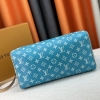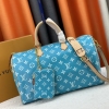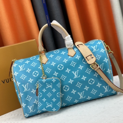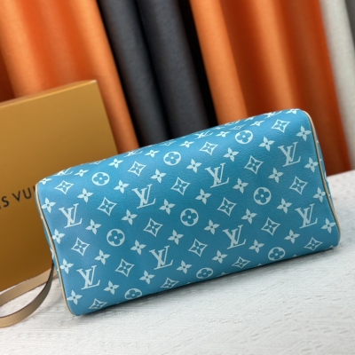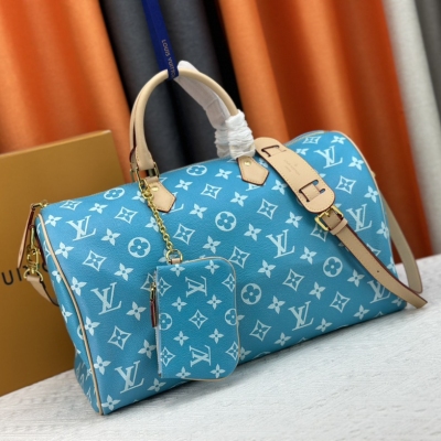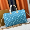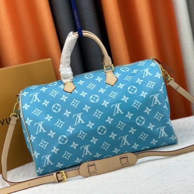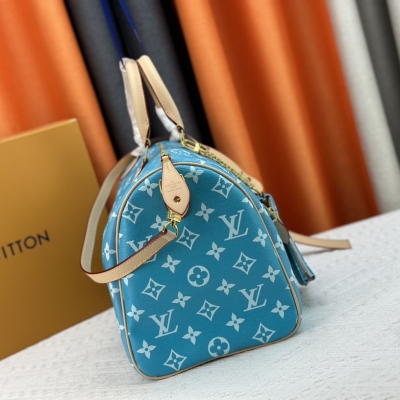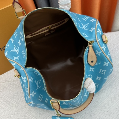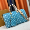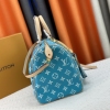 LV/ M24422 本款 Speedy P9 Bandoulière 40 Monogram Leather 手袋为柔软粒面牛皮革包裹羊皮革内衬,以丝印 Monogram 图案呈现帆布印花的迷离观感,道出创意总监 Pharrell Williams 的新季巧思。尺寸:40x26x23cm,颜色:蓝色/绿色