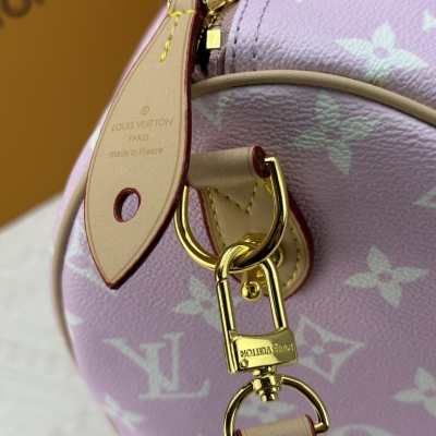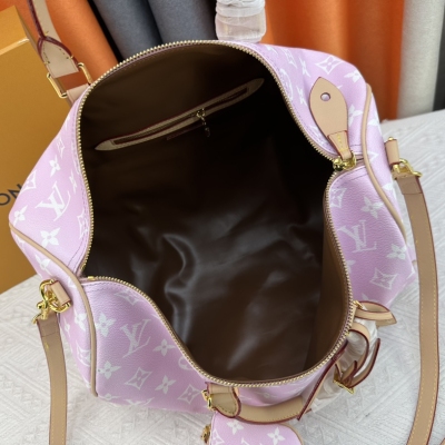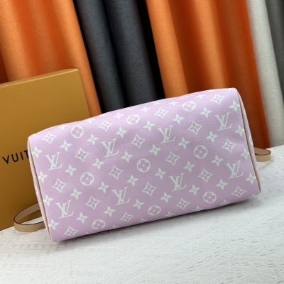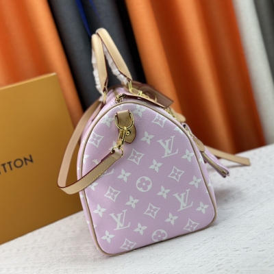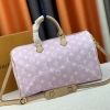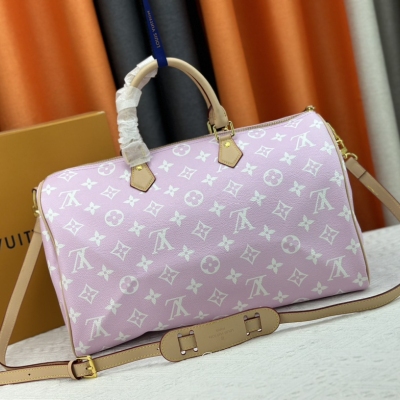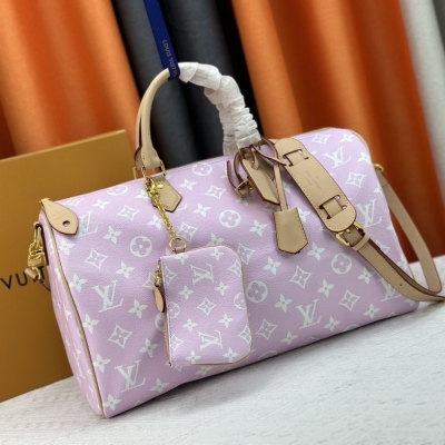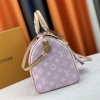 LV/ M24422 本款 Speedy P9 Bandoulière 40 Monogram Leather 手袋为柔软粒面牛皮革包裹羊皮革内衬,以丝印 Monogram 图案呈现帆布印花的迷离观感,道出创意总监 Pharrell Williams 的新季巧思。尺寸:40x26x23cm,颜色:淡粉色