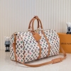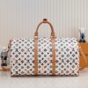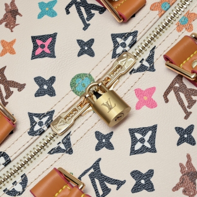 LV/M41416 M24901 本款 Keepall Bandoulière 50 旅行袋取材缤纷 Monogram Craggy 帆布,呈现 Tyler 手绘的 Monogram 图案、雏菊和㹴犬元素。细腻牛皮革包裹顶部手柄、侧带、可拆卸肩带和可拆卸波浪效果名牌。尺寸:50x29x23cm