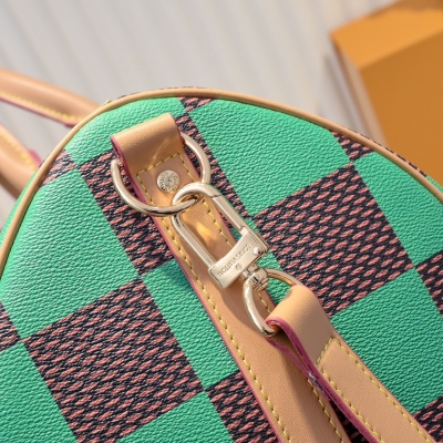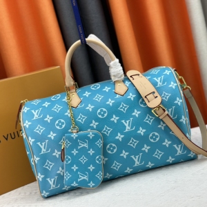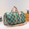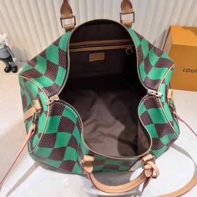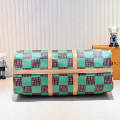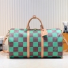 LV/升级版M40667 M41416 本款 Keepall Bandoulière 50 旅行袋取材 Damier Golf 涂层帆布,以高尔夫球场的明丽色调彰显清新活力。牛皮革塑造侧带和顶部手柄,后者点缀路易威登花卉装饰,可拆卸并调节的皮革肩带实现舒适肩背体验。尺寸:50x29x23cm
